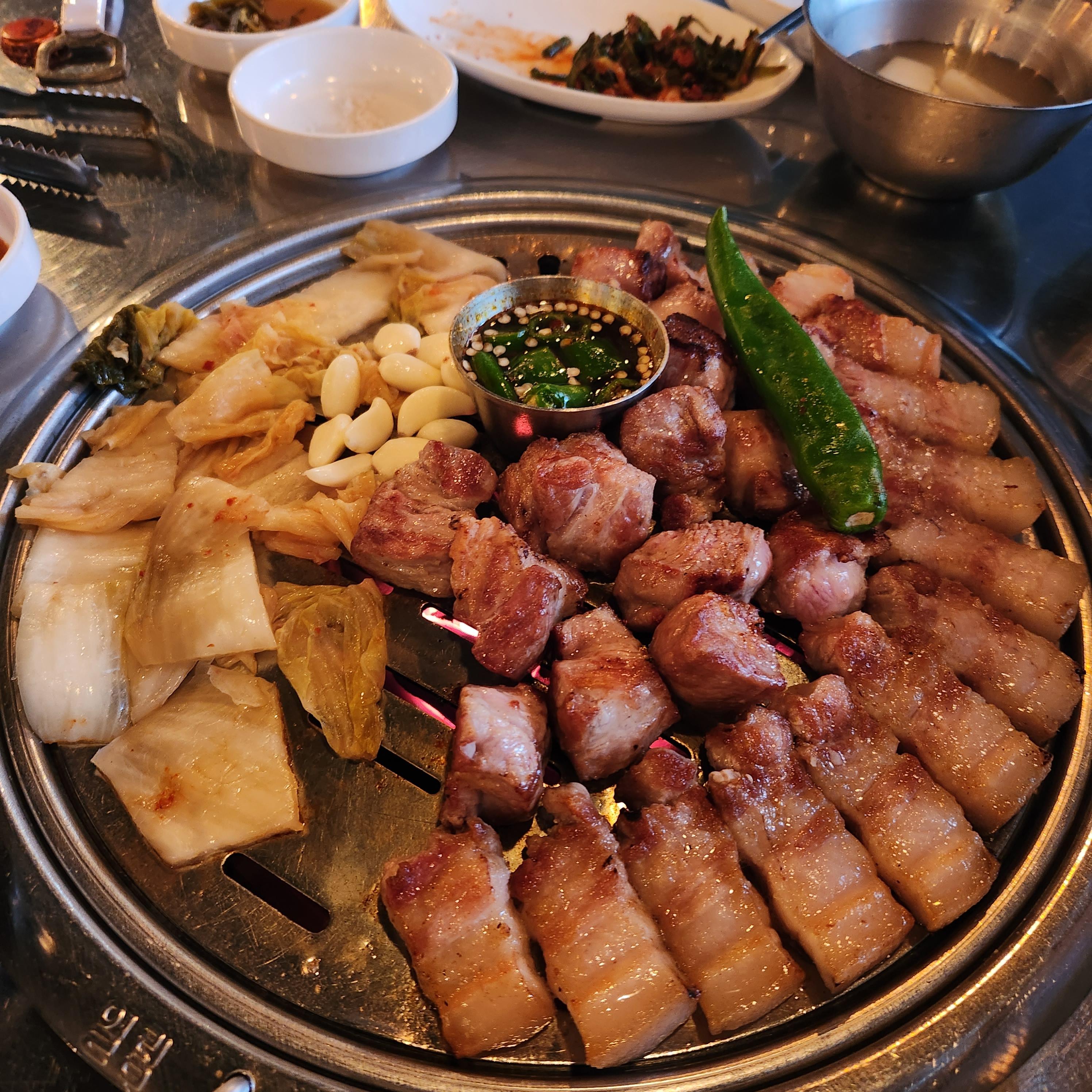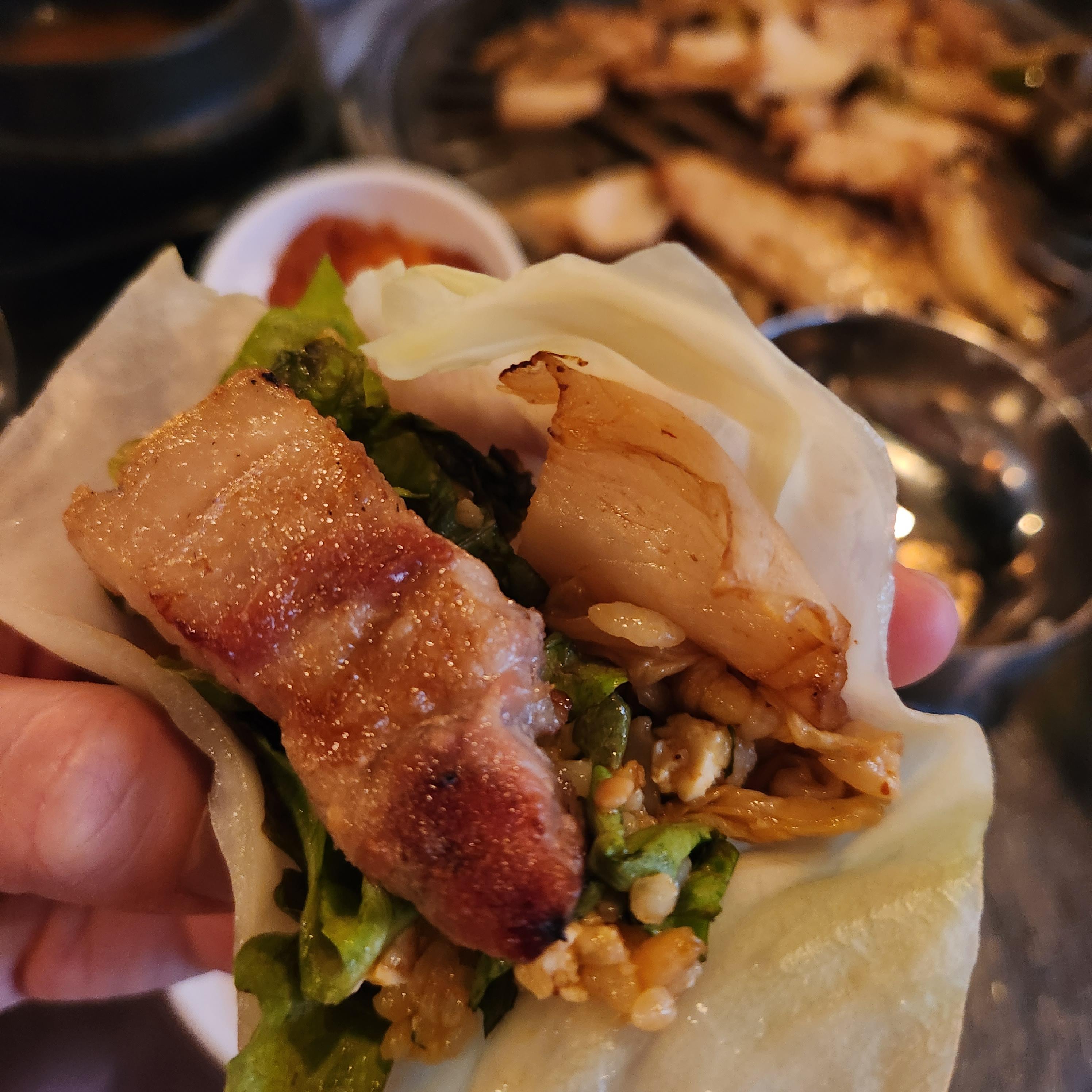 마늘 기름장에 찍어 먹어도 맛있지만, 잘 구워진 묵은지랑 조함이 기가 막힌다.