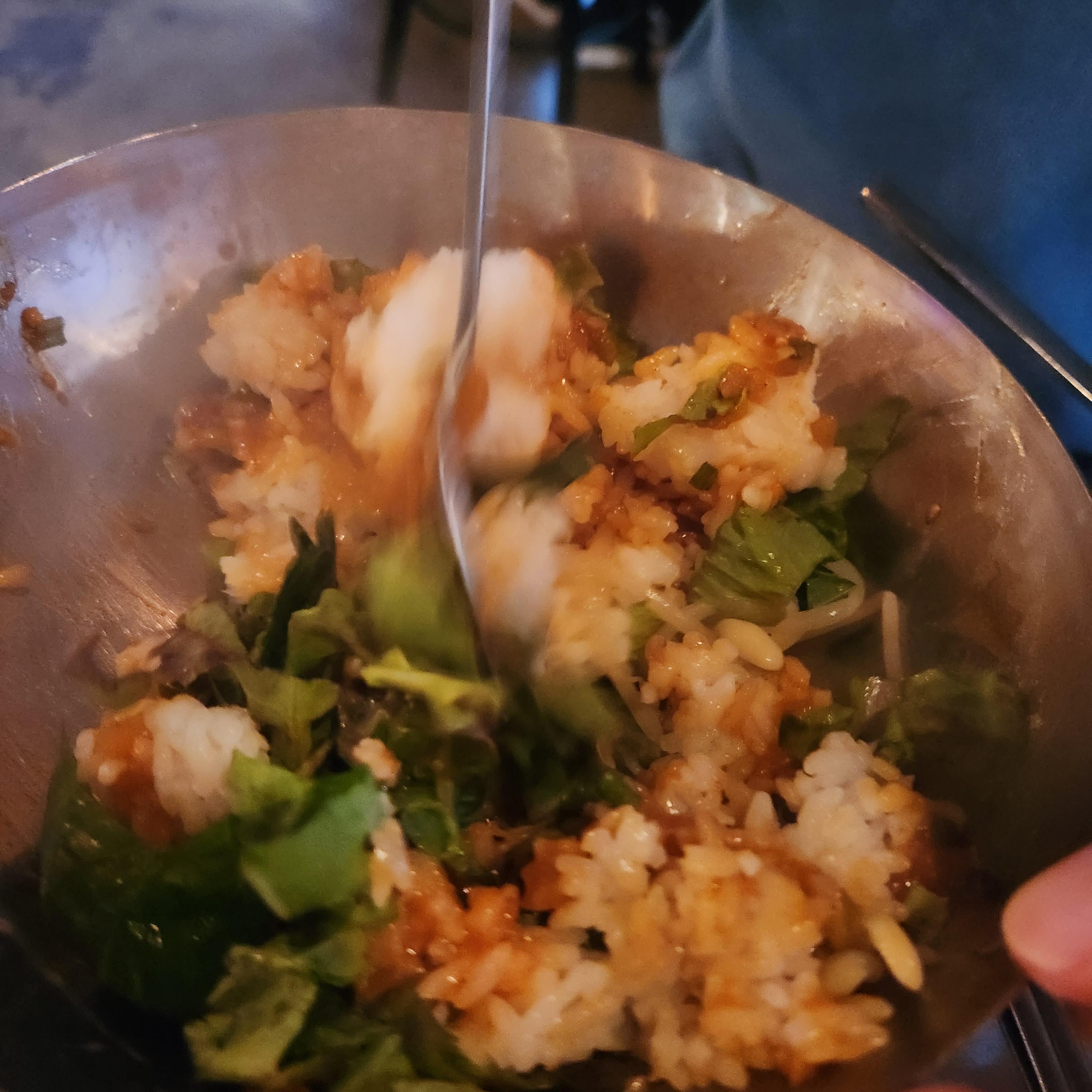양푼에 밥과 강된장을 넣어 슥슥 비비면 맛있는 강된장비빔밥이 완성된다.
