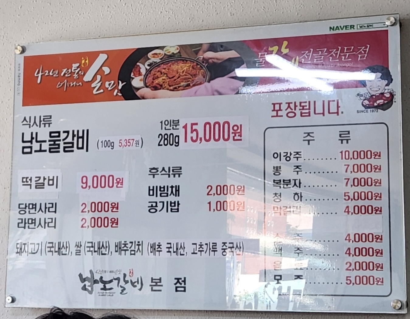 메뉴판이다. 남노물갈비 단일메뉴이다.
