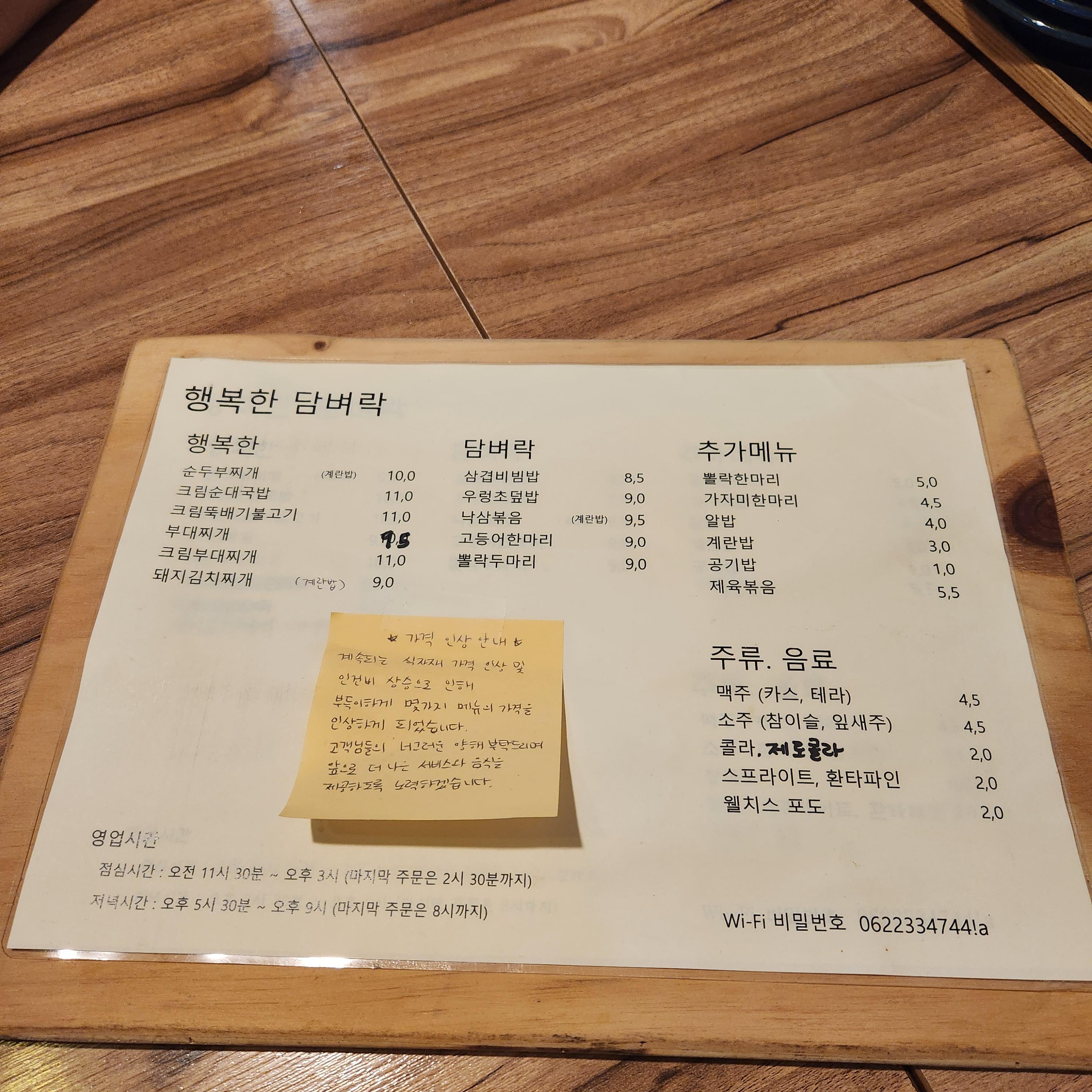 메뉴판이다. 간단한 한식 메누들 사이에 특이한 메뉴들이 눈에 띈다.