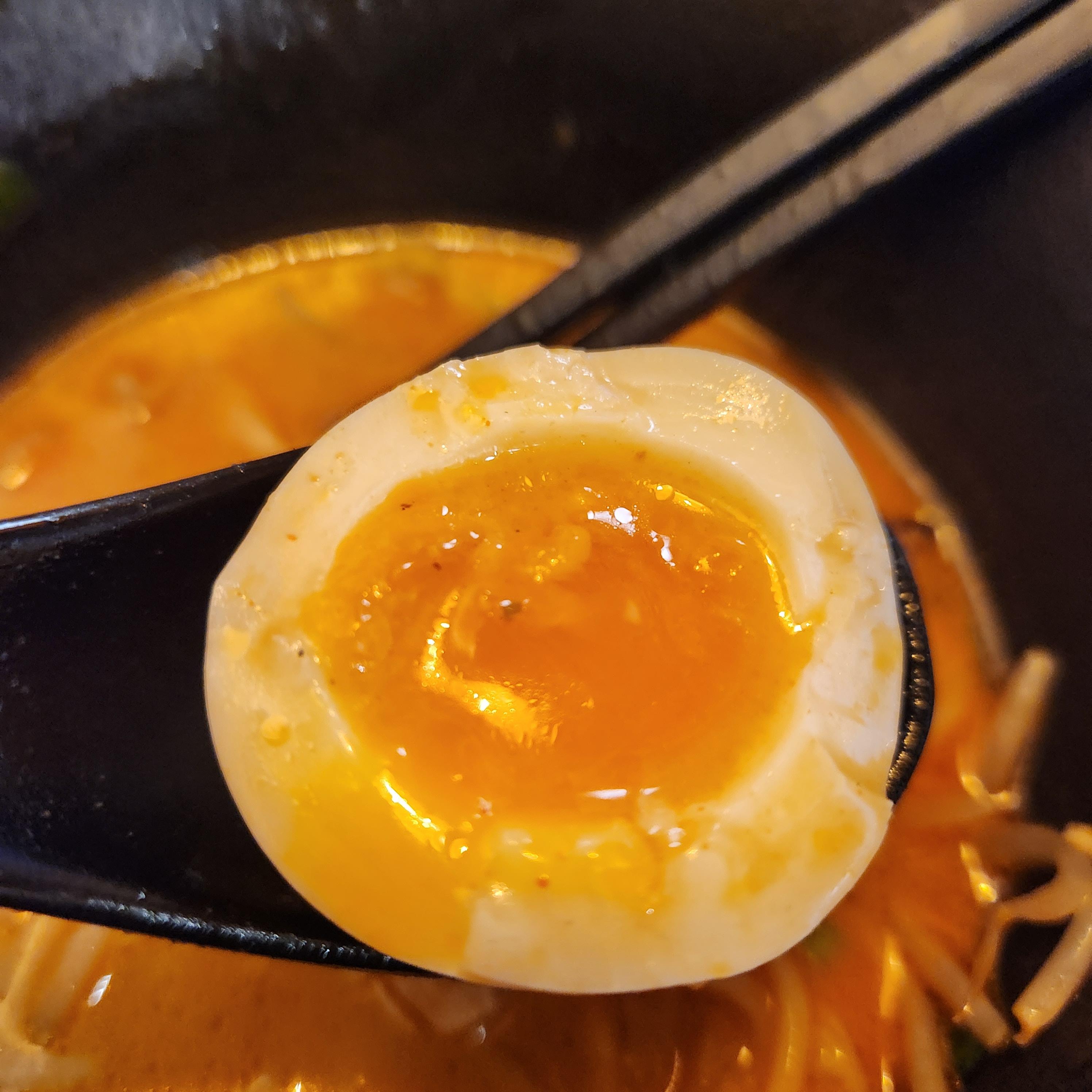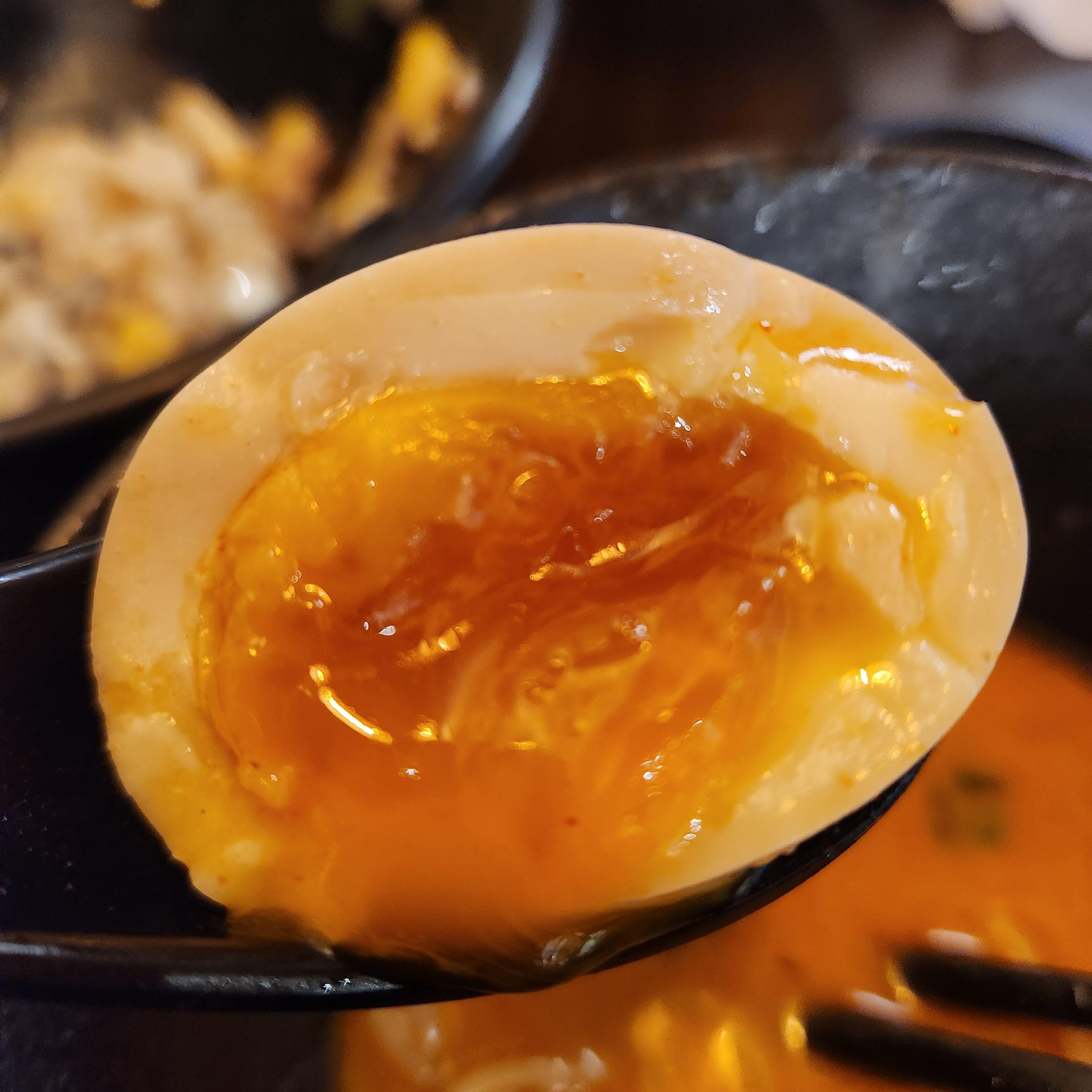 올려진 달걀, 그냥 일반 반숙란인 줄 알았는데 그냥 먹어도 양념을 베고 있어 풍미가 진하다.
