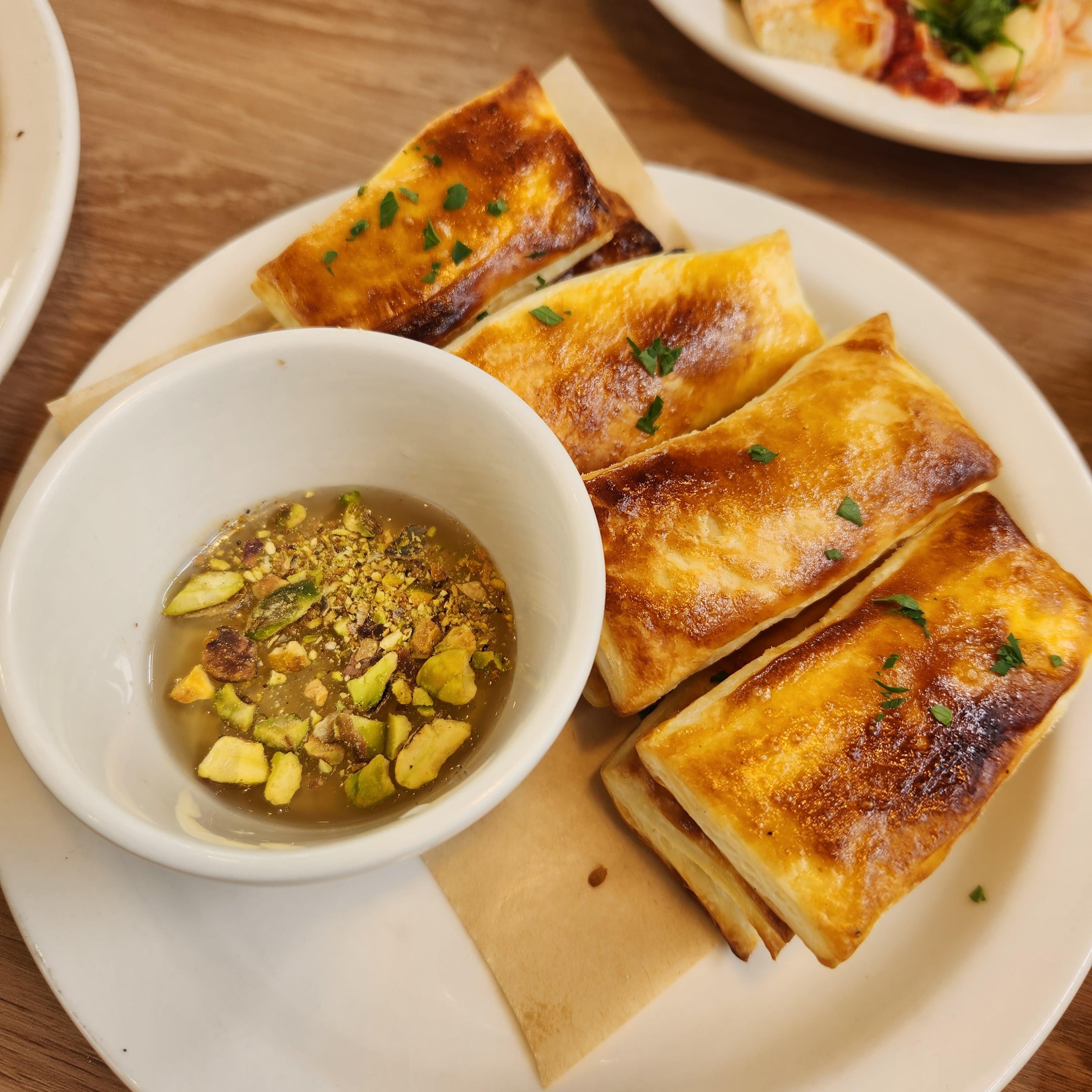 갓 구워진 페스츄리가 바삭, 고소하고 꿀에 찍어 먹으면 달달하다.