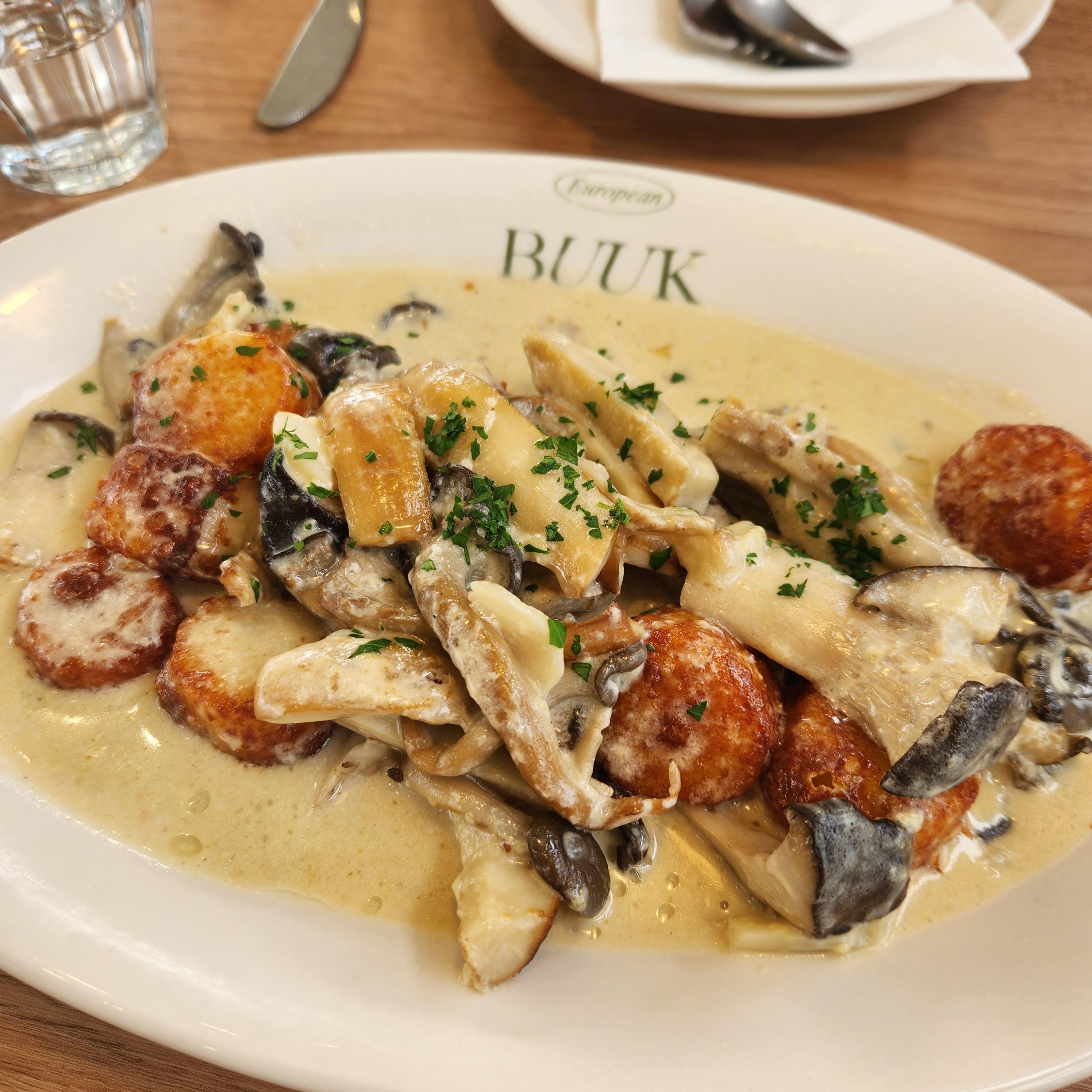 담백하고 고소한 크림소스에 버섯이 가득해 풍미가 엄청나다. 감자 뇨끼는 고소하고 쫄깃쫄깃하다.