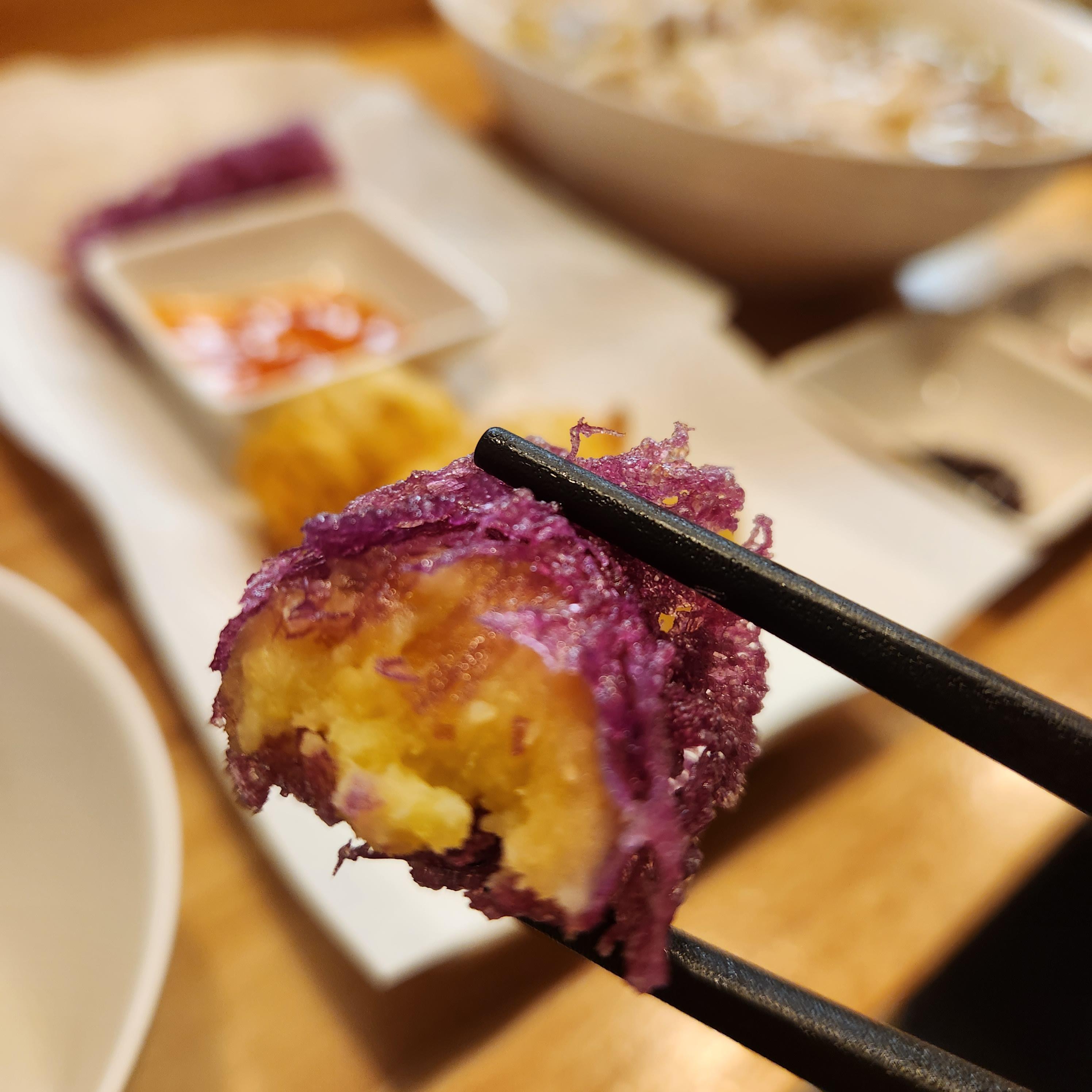 겉으로 보기엔 자색 튀김옷을 입은 튀김 같다.