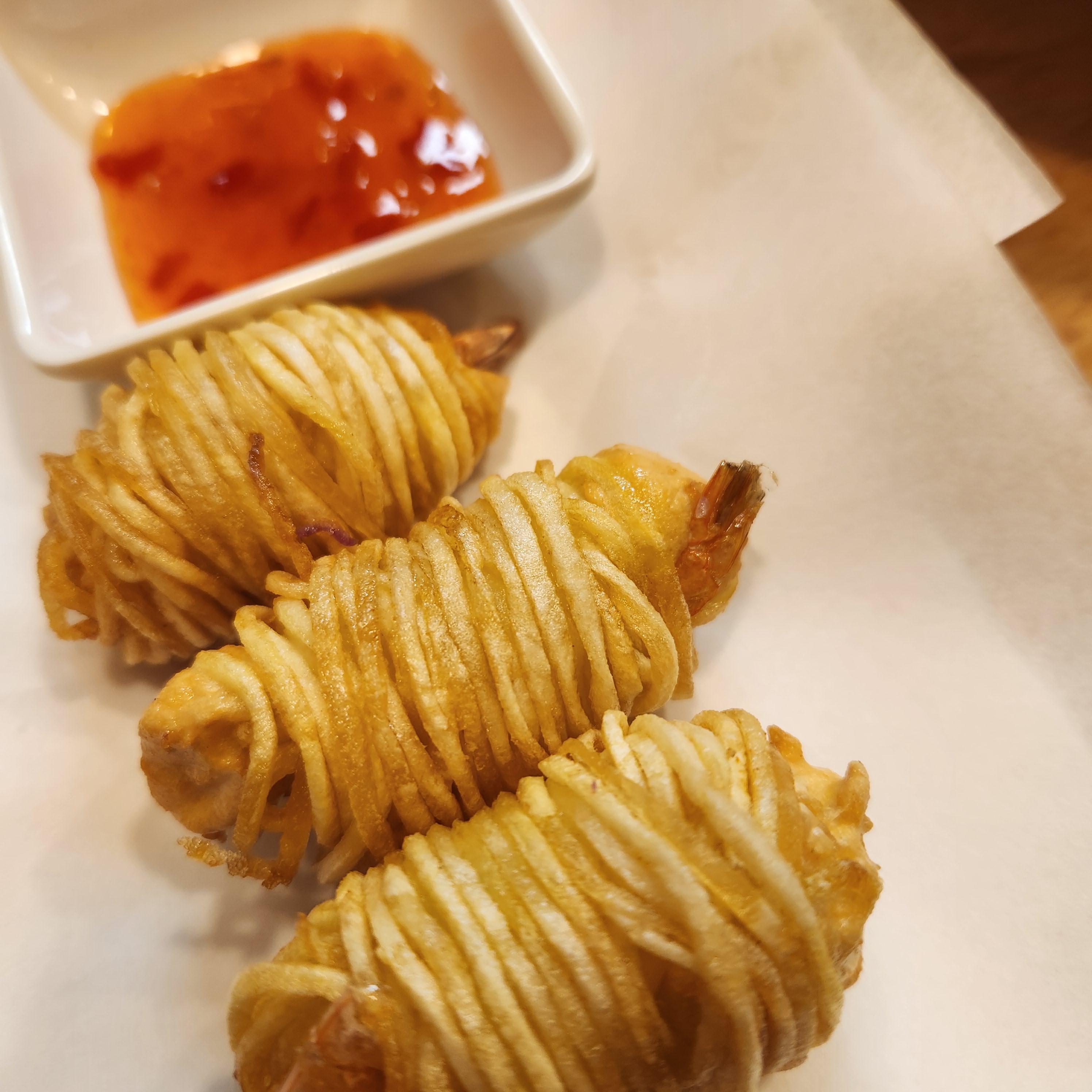 감자말이 새우도 3조각이 한 세트이다. 국수 모양의 감자채 튀김이 바삭하다.