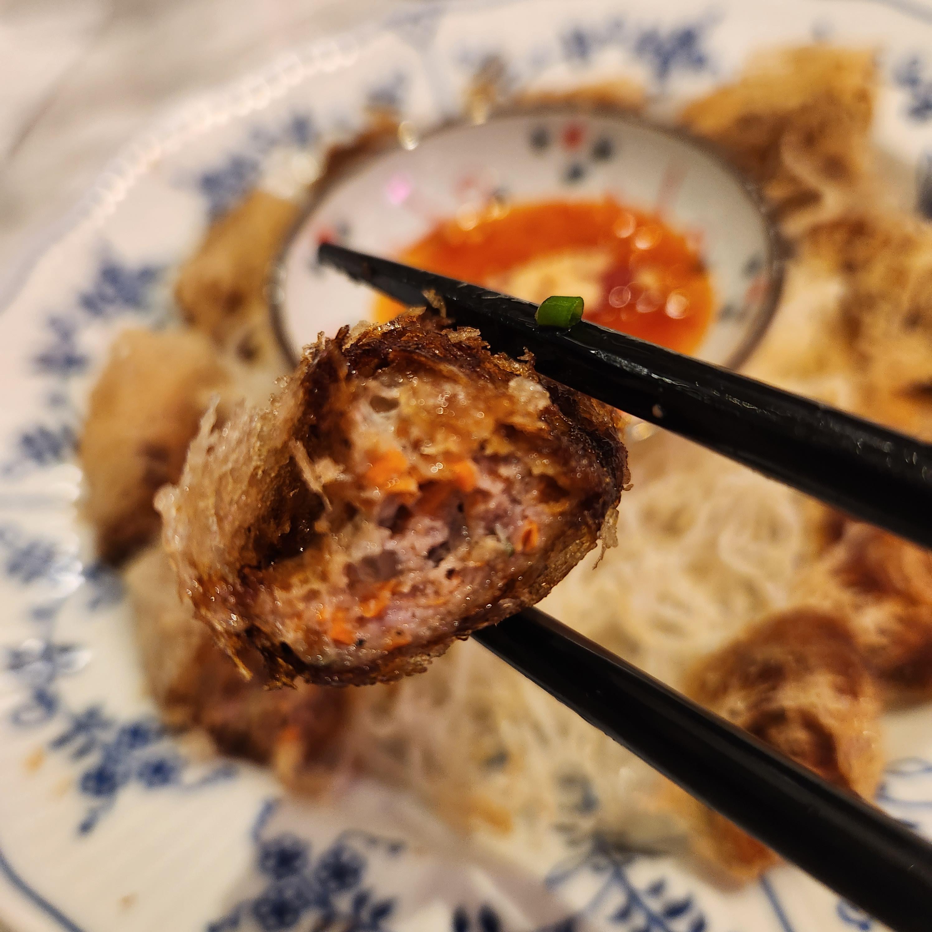 다진 닭고기와 야채볶음과 양상추 그리고 바삭한 라이스 스틱이 함께 나온다.