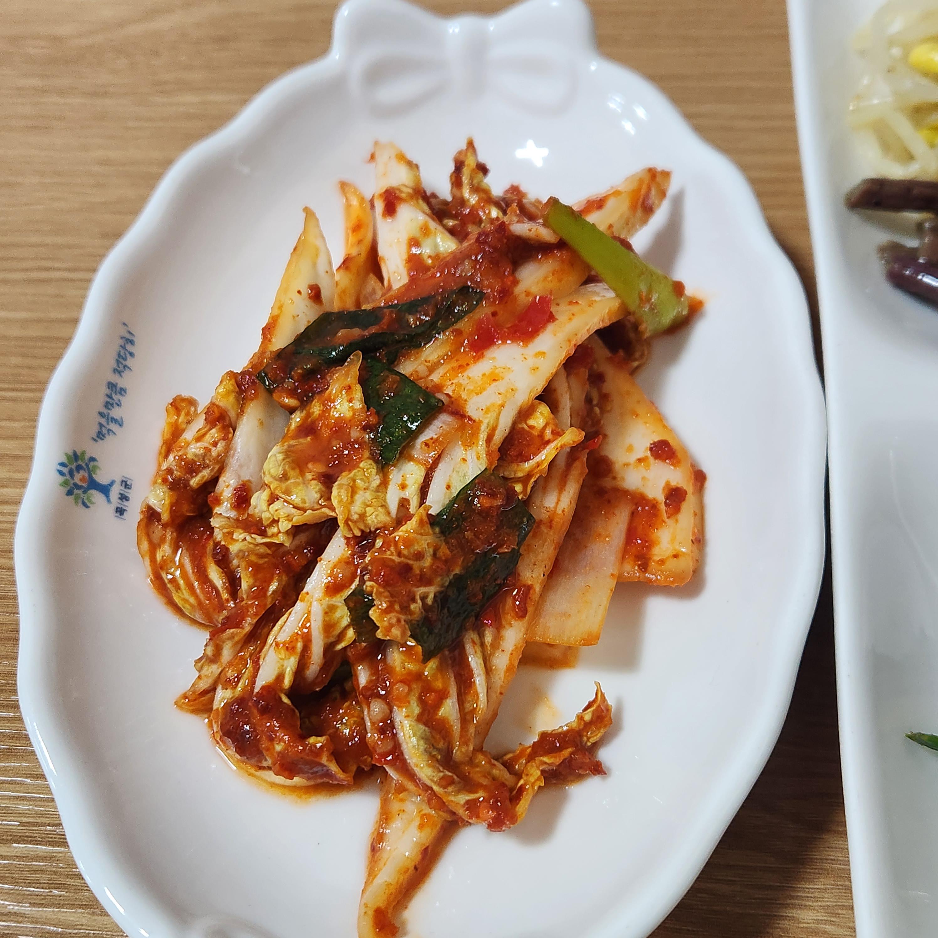 밑반찬은 겉절이와 콩나물, 고사리, 시금치, 무생채 그리고 어묵볶음이다.
