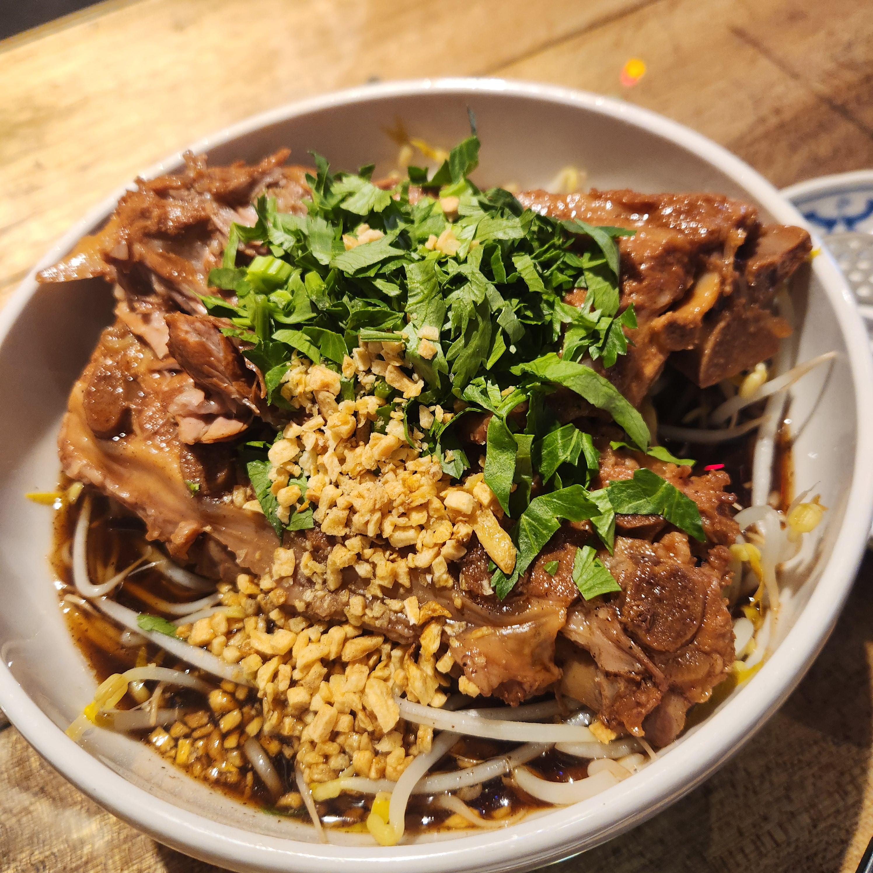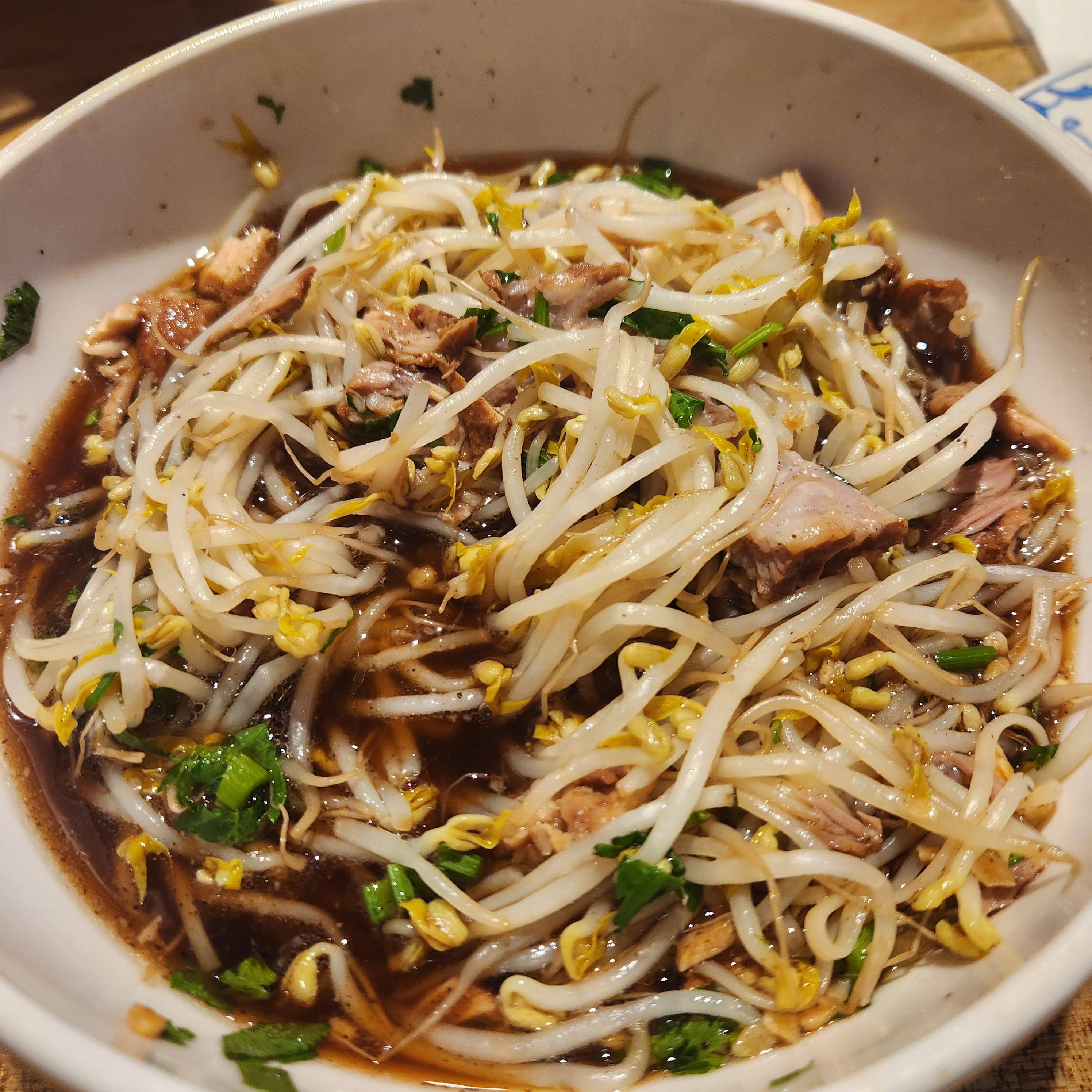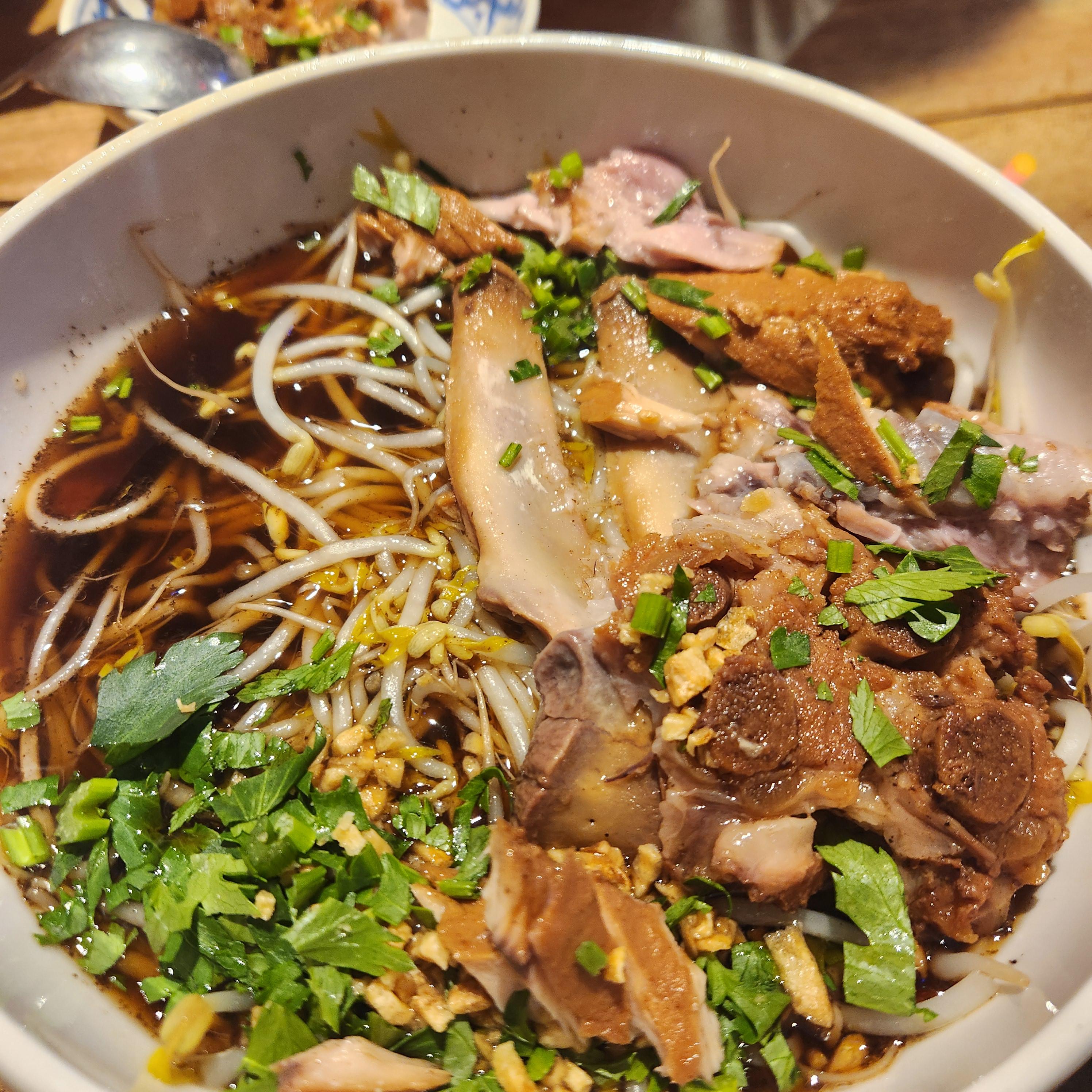 이전에 먹었던 쌀국수와 달리 국물이 적었다. 국물보다는 육수같았고 기름지거나 자극적이지 않고 생각보다 맑고 깔끔했다. 돼지등뼈 쌀국수에는 면 위에 엄청난 사이즈의 돼지등뼈 2덩이와 숙주가 듬뿍 들어있었다. 등뼈의 살코기는 흔히 먹었던 뼈찜같지만, 뼈찜보다 양념이 깔끔하고 부드러워서 담백하게 먹기 좋았다. 등뼈에서 살을 발라내다보면 뼈 아래 숨어있던 숙주와 면을 함께 먹으면 아삭 쫄깃 다양한 식감을 즐기며 맛볼 수 있다. 어디서도 먹지 못했던 맛인데 진짜 맛있었다.