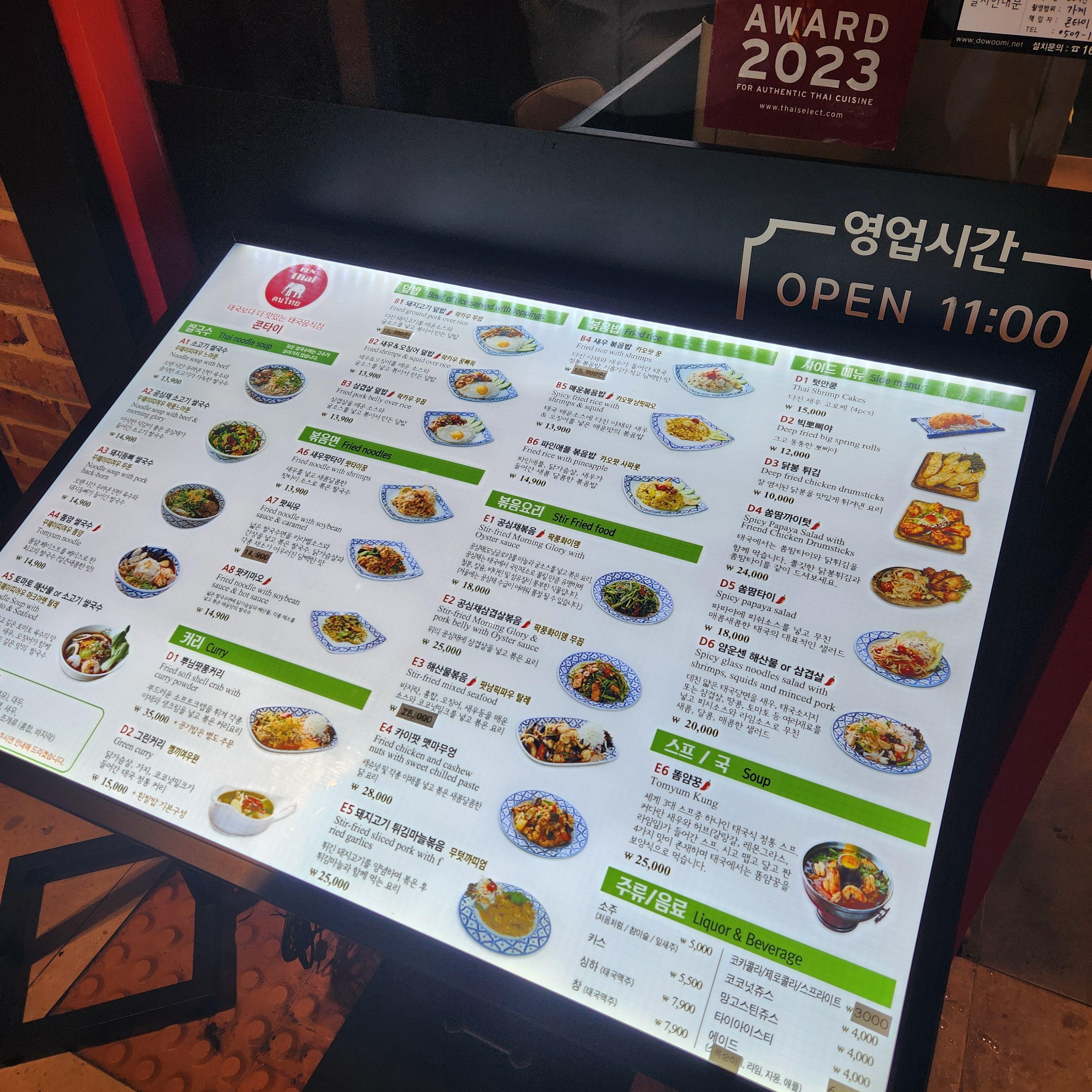 다양한 태국 음식이 있는 콘타이. 낯선 태국음식 도전하는게 고민스러웠는데 매장 앞에 음식 사진과 자세한 설명이 적힌 메뉴판이 놓여있어 덕분에 도전해볼 용기가 생겼다.