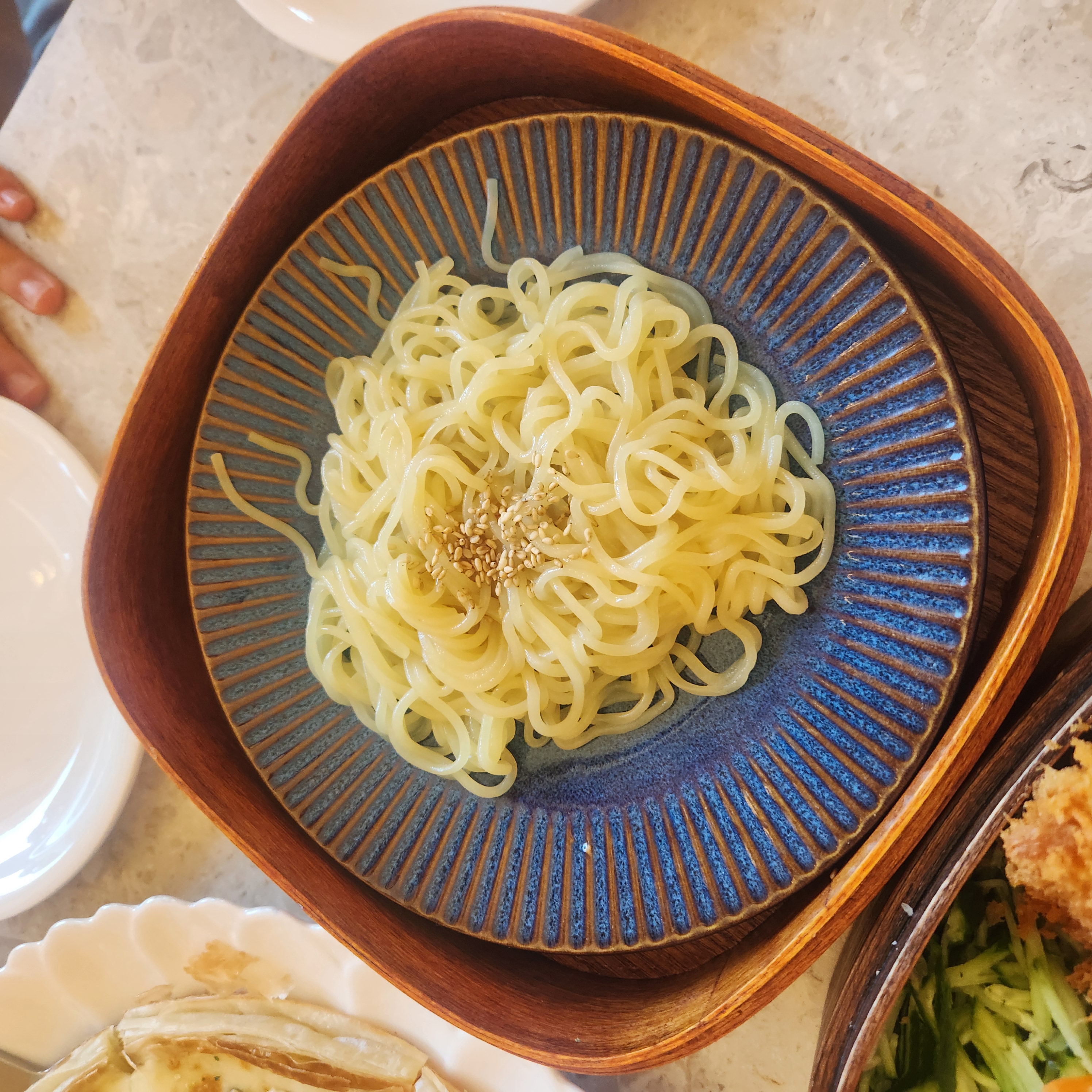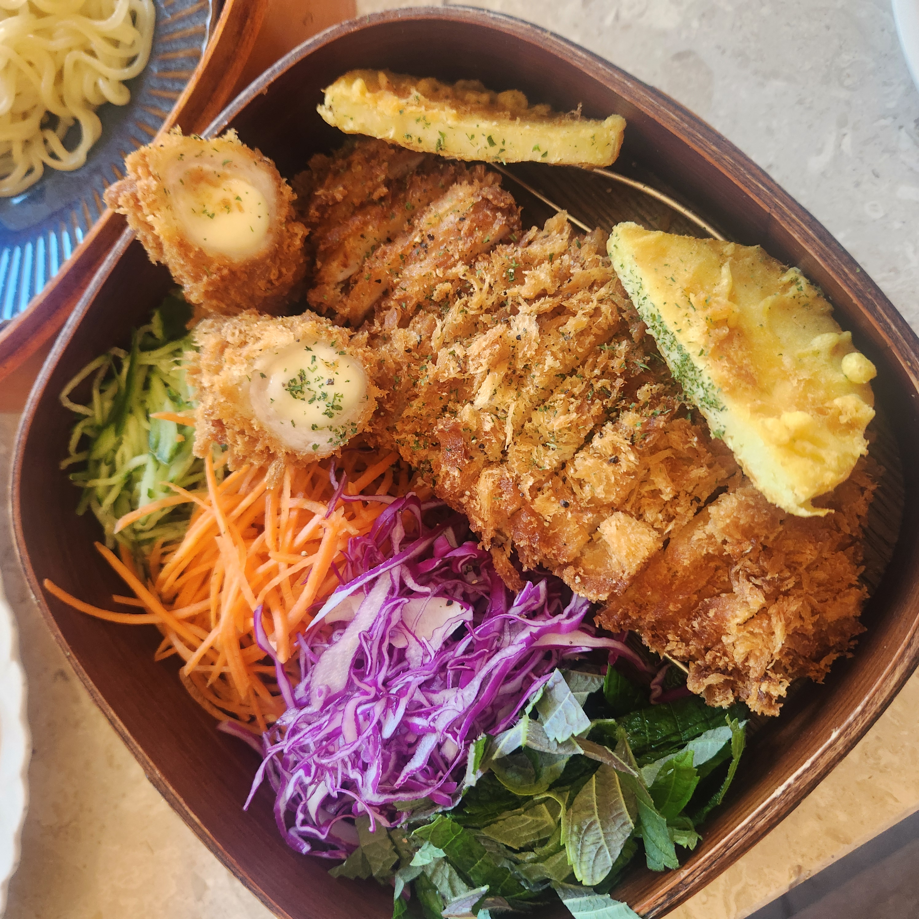그리고 마당의 시그니처 쌈돈가스. 도시락 통에 넣어주신다. 1층은 쫄면이 2층은 등심돈가스들과 월남쌈 채소가 함께 들어있다. 마당의 쌈돈가스는 월남쌈 페이퍼를 물에 담궈 풀어서 싸먹는게 아니라 월남쌈 페이퍼를 그대로 두고 채소, 돈가스를 넣고 싸먹는다. 월남쌈 페이퍼의 바삭함과 채소의 아삭함까지 식감이 장난아니다. 소스는 칠리소스와 청양마요소스가 있는데 청양마요소스가 젤 맛있었다. 쫄면, 돈가스로 느끼해진 입맛을 매콤상큼함으로 게운하게 정리해준다. 먹꿀팁! 쫄면과 채소는 1번 리필 무료니 꼭 챙겨서 리필해드시길! (채소와 쫄면을 넣어 비벼먹으면 분식집 쫄면)