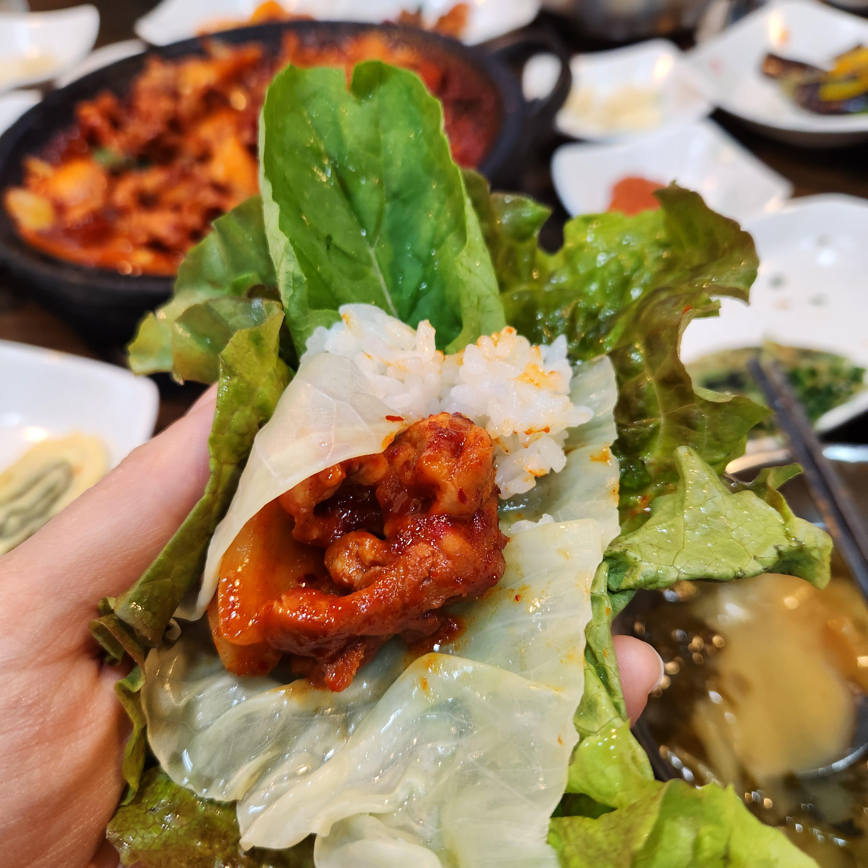 다양한 쌈채소와 두툼한 고기 한 점을 올려 싸먹으면 진짜 맛있다.