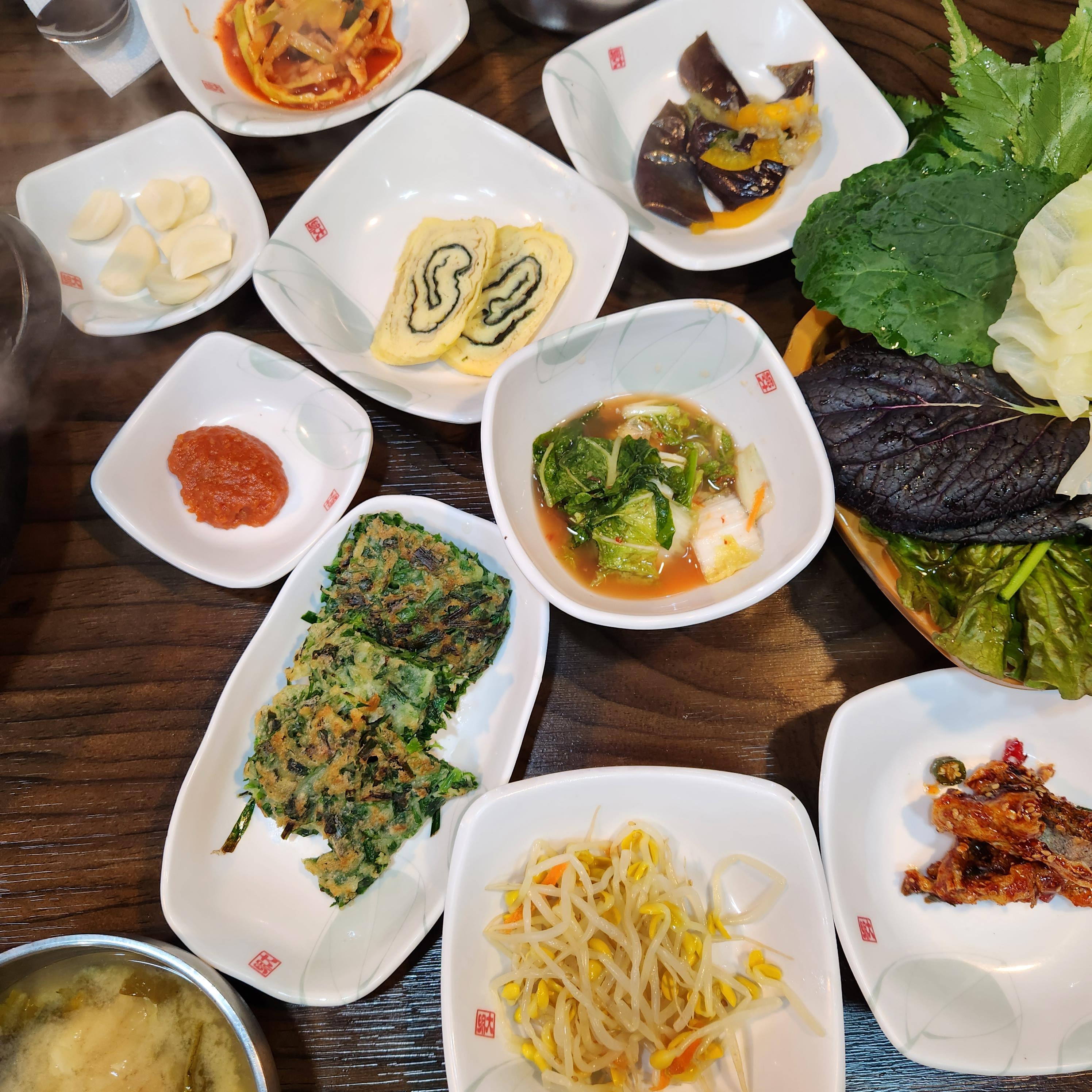 황태껍질무침, 콩나물, 물김치, 부추전, 달걀말이, 가지나물, 죽순초무침, 쌈다시마, 젓갈, 배추김치, 피클 등 기본 반찬들 종류가 다양하다.