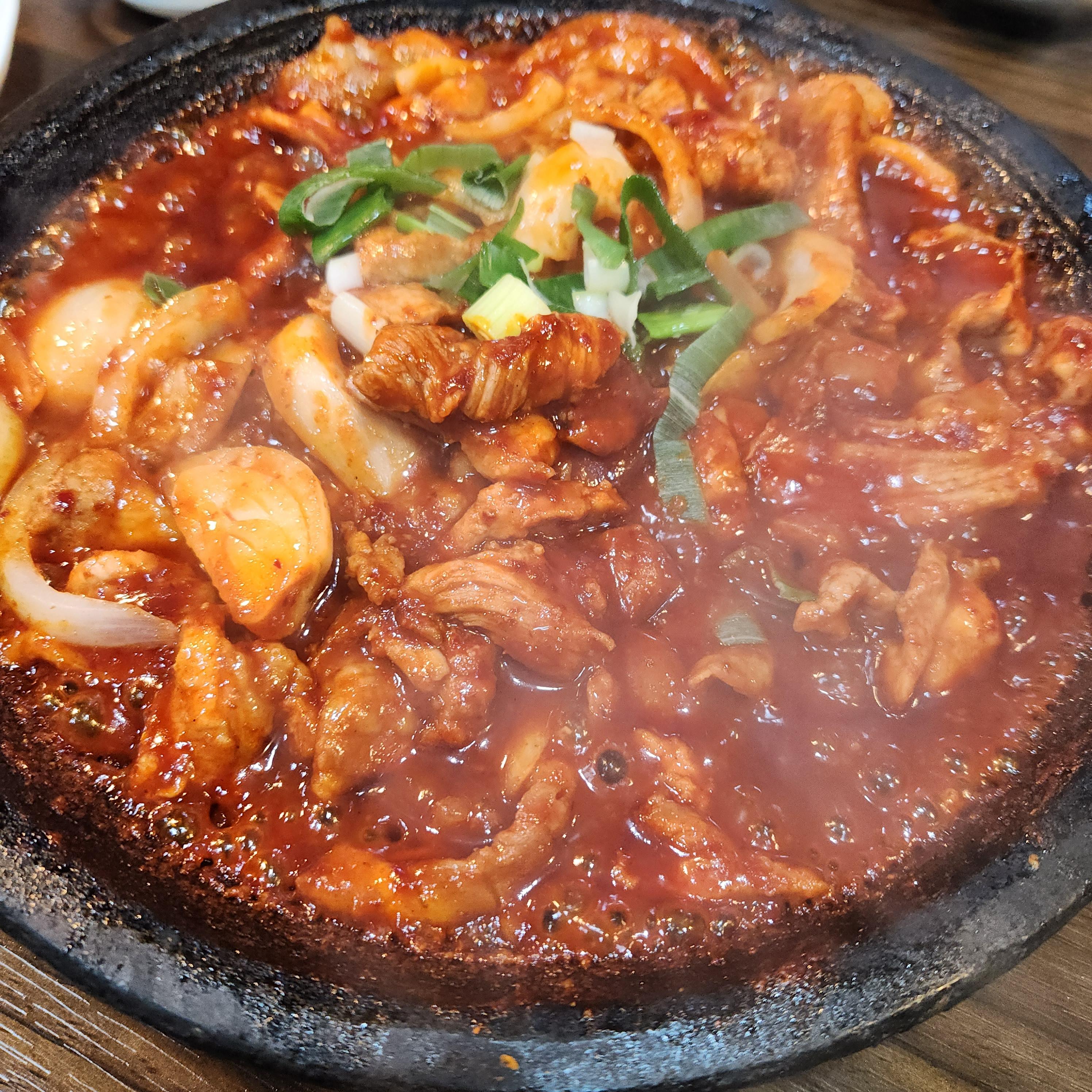 돼지고기는 돌판에 올려진 매콤한 제육볶음으로 나온다.